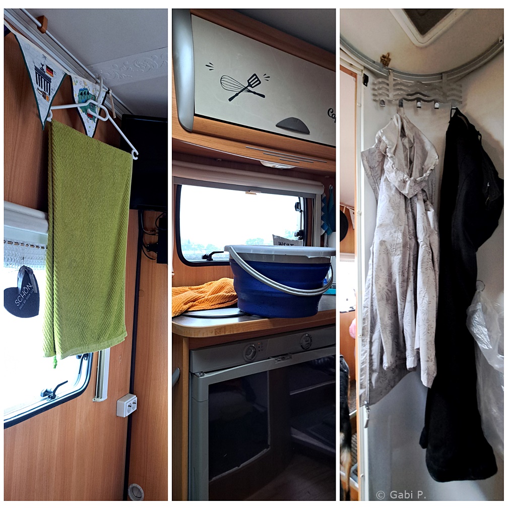 Im ganzen Roadrunner verteilt nasses Zeugs: Schuhe Regenjacke, Hosen....dazu dann noch die ganzen nassen Handtücher vom Aufwischen und von heute während der Fahrt .