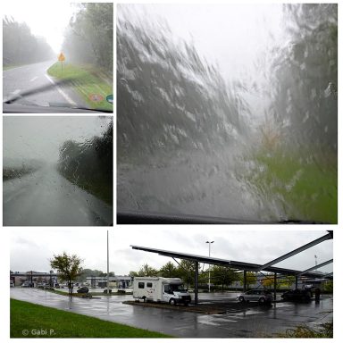 Mehrere Starkregenschauer hatten wir während der Fahrt, einmal haben wir in einer Parkbucht angehalten und das Schlimmste abgewartet.