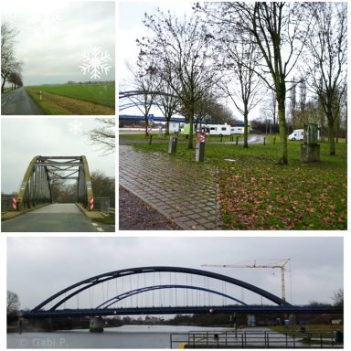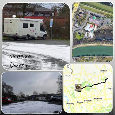 In Dorsten haben wir zuerst den Stellplatz beim Sporthafen angefahren, weil wir den noch nicht kannten. Aber dort irgendwo zwischen den aufgebockten Schiffen zu stehen, sagte uns nicht zu. ich denke im Sommer könnte es schön dort sein, vor allen ruhig.