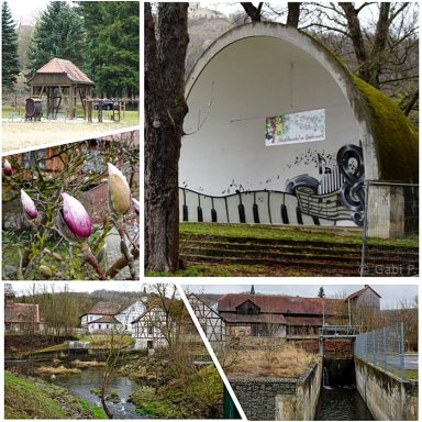 Es ging hoch und runter, vorbei und durch kleine Orte und über kleine Straßen, die mehr oder weniger gut befahrbar waren. Kurz vor dem Ziel, dann Gefälle von 18%, runter in den Ort Bad Sulza und nun stehen wir zwischen Freibad und Gradierwerk. Hier kann man schön spazieren gehen und auch das Wetter ist heute (noch) besser.