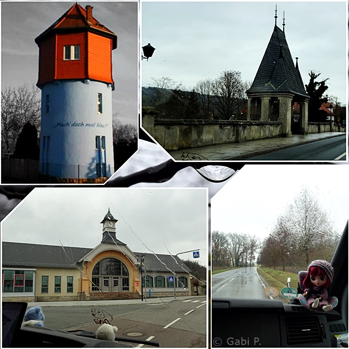 Es ging hoch und runter, vorbei und durch kleine Orte und über kleine Straßen, die mehr oder weniger gut befahrbar waren. Kurz vor dem Ziel, dann Gefälle von 18%, runter in den Ort Bad Sulza und nun stehen wir zwischen Freibad und Gradierwerk. Hier kann man schön spazieren gehen und auch das Wetter ist heute (noch) besser.
