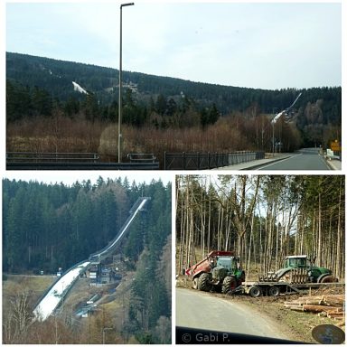Unterwegs sahen wir tatsächlich nochmals Schnee, aber den aus Schneekanonen und zwar auf dem Berg gegenüber von Bischofsgrün. Das eine sieht doch sehr nach Sprungschanze aus.