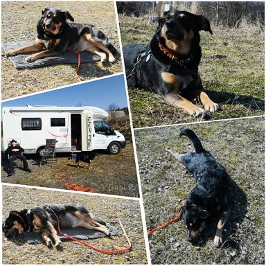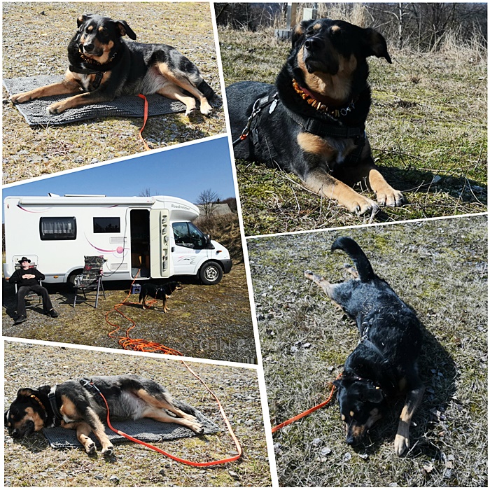Die Sonne scheint, im Windschatten des Wohnmobils kann man es draußen gut aushalten und dabei die Natur und Ruhe drumherum genießen. Eni fand das auch ganz toll. Und spazierengehen kann man ebenfalls. Manchmal braucht es ganz wenig um zufrieden und glücklich zu sein…… und morgen brauchen wir dann wieder einen Platz, wo die Entsorgung funktioniert.