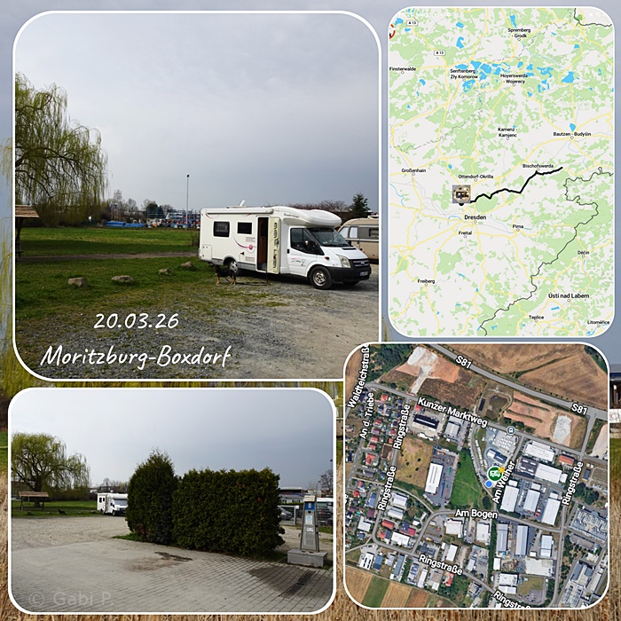 Somit fuhren wir heute mal wieder nur eine kurze Etappe, zu einem Stellplatz bei einem Wohnmobilhändler im Industriegebiet in Moritzburg-Boxdorf, nördlich von Dresden. Ein kleiner zugewucherter Weiher und eine Wiese direkt daneben.