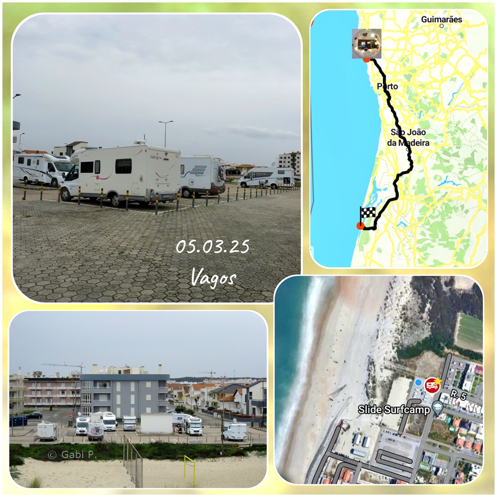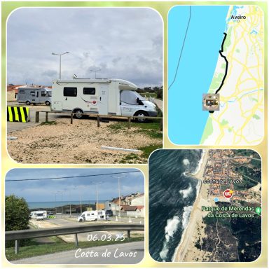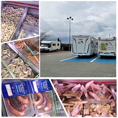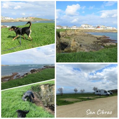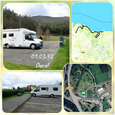Nach dem Einkaufen fuhren wir in (Steil)küstennähe bis nach San Cibrao. Der Stellplatz dort hat eine tolle Lage, direkt am zerklüftetem Steinstrand. Aber der Wind ist heute kalt und heftig, der Roadrunner wackelte mitunter stark.