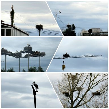 Überall sah man Störche auf allen erdenklichen Masten sitzen, viele Nester, erstaunlich dicht beieinander, teils sogar in Bäumen (leider sind die Fotos nicht wirklich scharf)